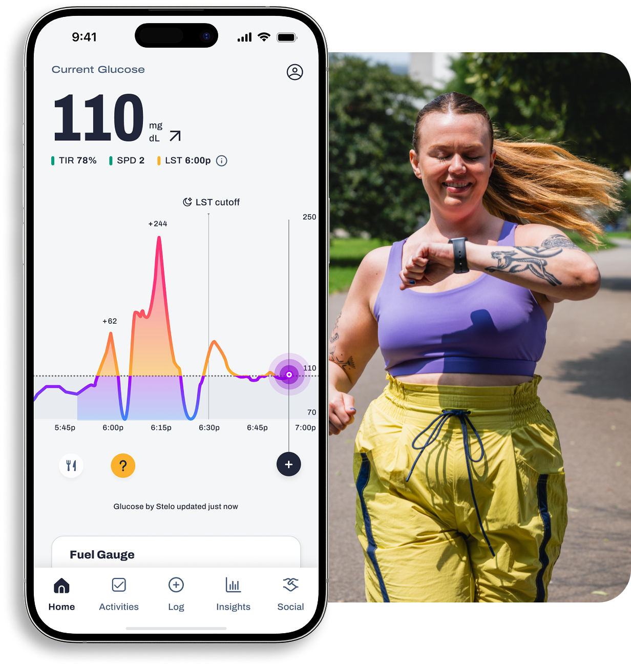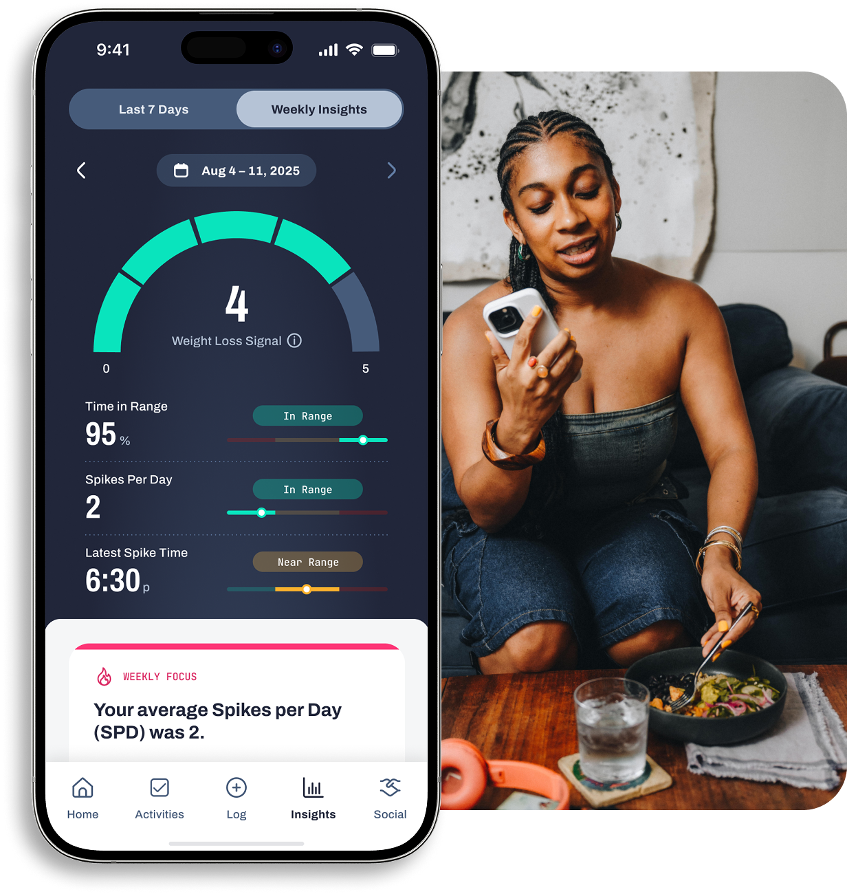 The Signos app alerts you to glucose spikes that put you at risk of storing excess energy. Real-time recommendations based on millions of data points help you take action.